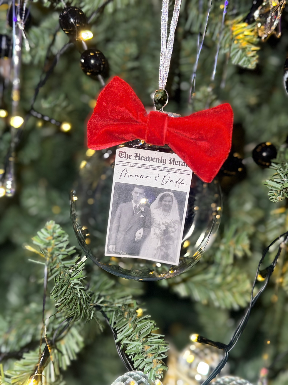 Please reply to your order confirmation email with the photo you'd like on the mini newspaper inside your bauble.